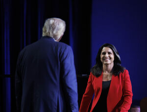 «تولسی گابارد» (چپ) نمایندهی سابق ایالت هاوایی در کنگرهی آمریکا و عضو سابق حزب دموکرات، ۲۲ اکتبر ۲۰۲۴، در یکی از مراسمهای تبلیغاتی «دونالد ترامپ» (راست) نامزد وقت انتخابات ریاستجمهوری آمریکا، سخنرانی میکند. گابارد، که از منتقدان ترامپ طی سالهای گذشته به حساب میآمد، سال ۲۰۲۴ رسماً اعلام کرد به حزب جمهوریخواه ملحق شده است. (+)
